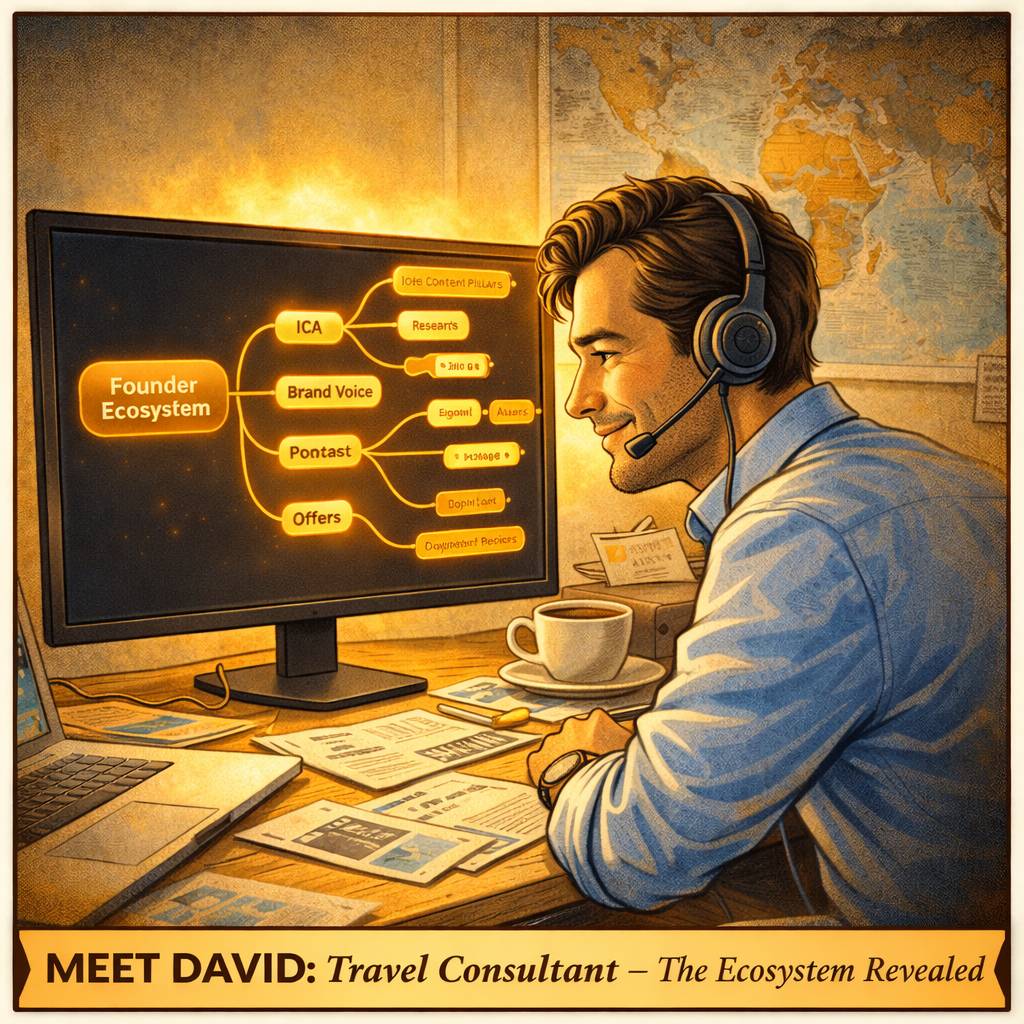 He had been running his travel agency for two years. Website half-finished. Podcast idea sitting in a voice memo. ICA defined in three different documents that never quite agreed with each other. Offers built reactively, not strategically.