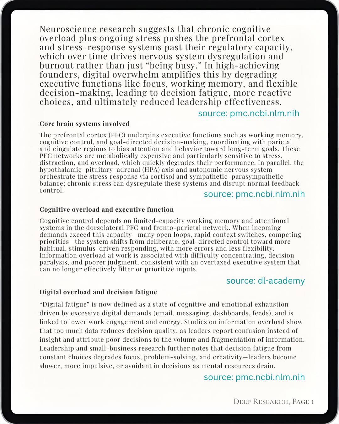 Saved in /Resources/Cognitive_Overload_Founder_Burnout_Research_Feb2026 — ready to reference when writing, teaching, or buildingFounder's Compass.