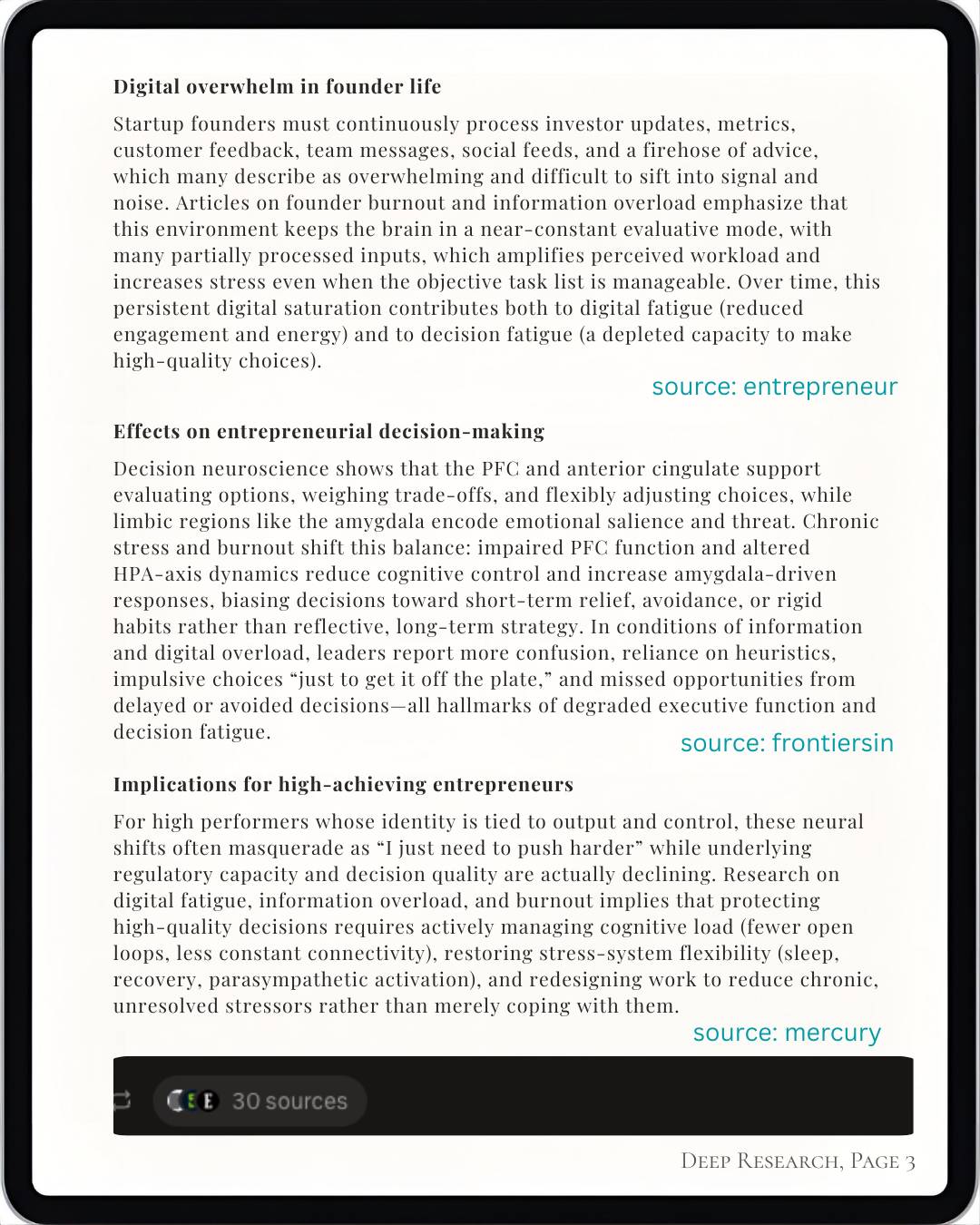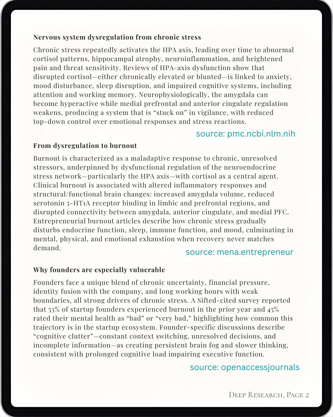 30 sources synthesized automatically — from neuroscience journals, founder health studies, and business research.